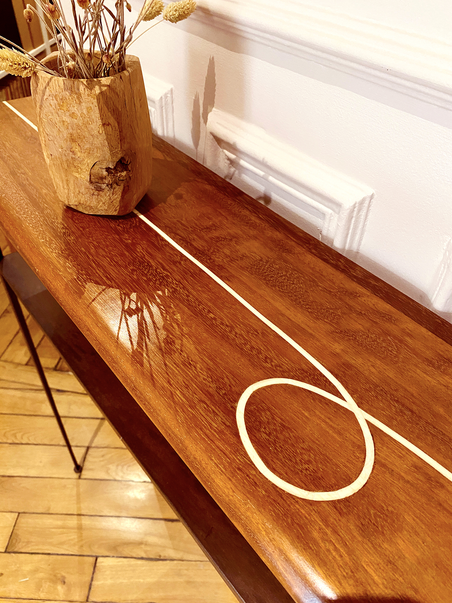 Ses pieds coupés en biseau accentuent la finesse de cette console et lui donnent un sentiment de légèreté. Fabriquée en collaboration avec 2 ébénistes togolais en 3 exemplaires avec un fil blanc différent pour chacune.